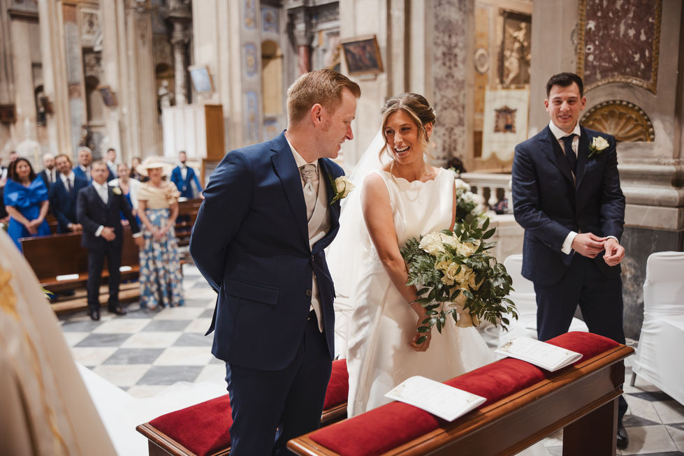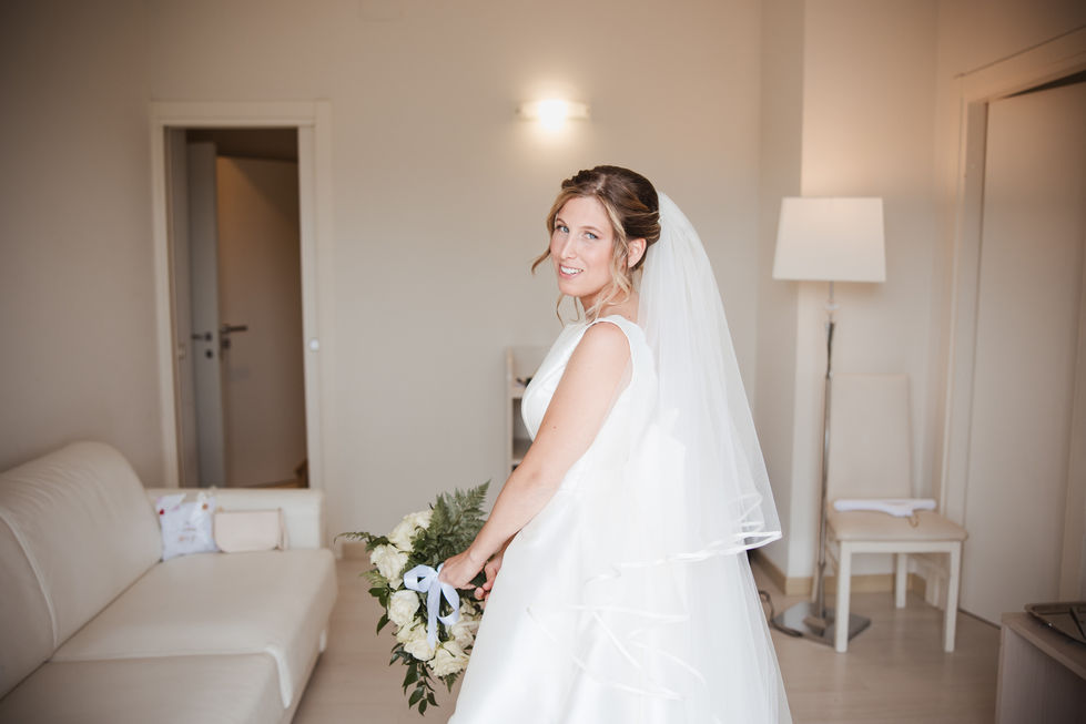 The wedding day the sun gently caressed the pastel-colored facades of the houses, while the sea breeze brought with it the scent orange blossoms. The church chosen for the ceremony was a jewel set in the streets of the village, with ancient frescoes and lit candles that gave a collected and solemn atmosphere.
